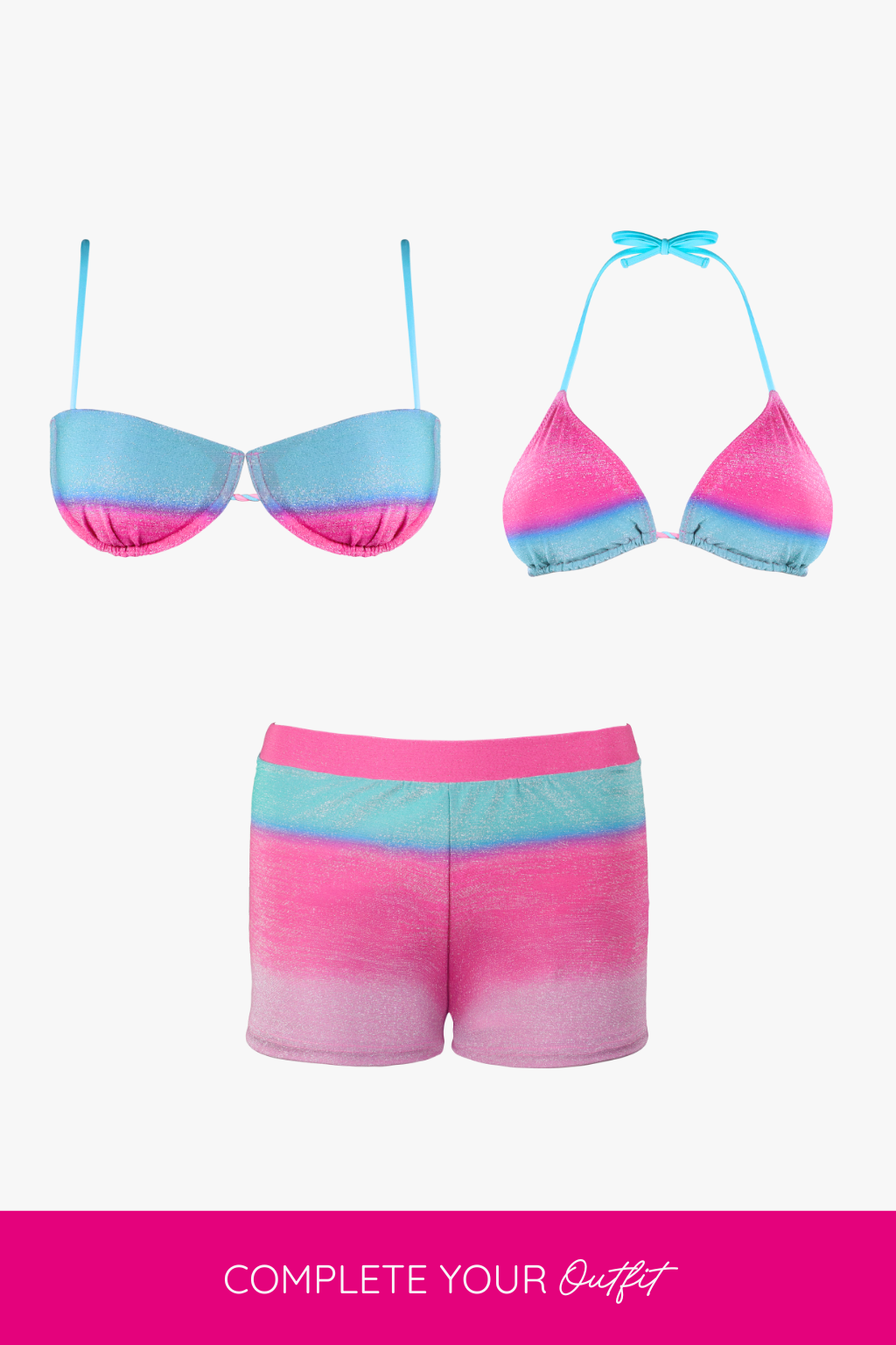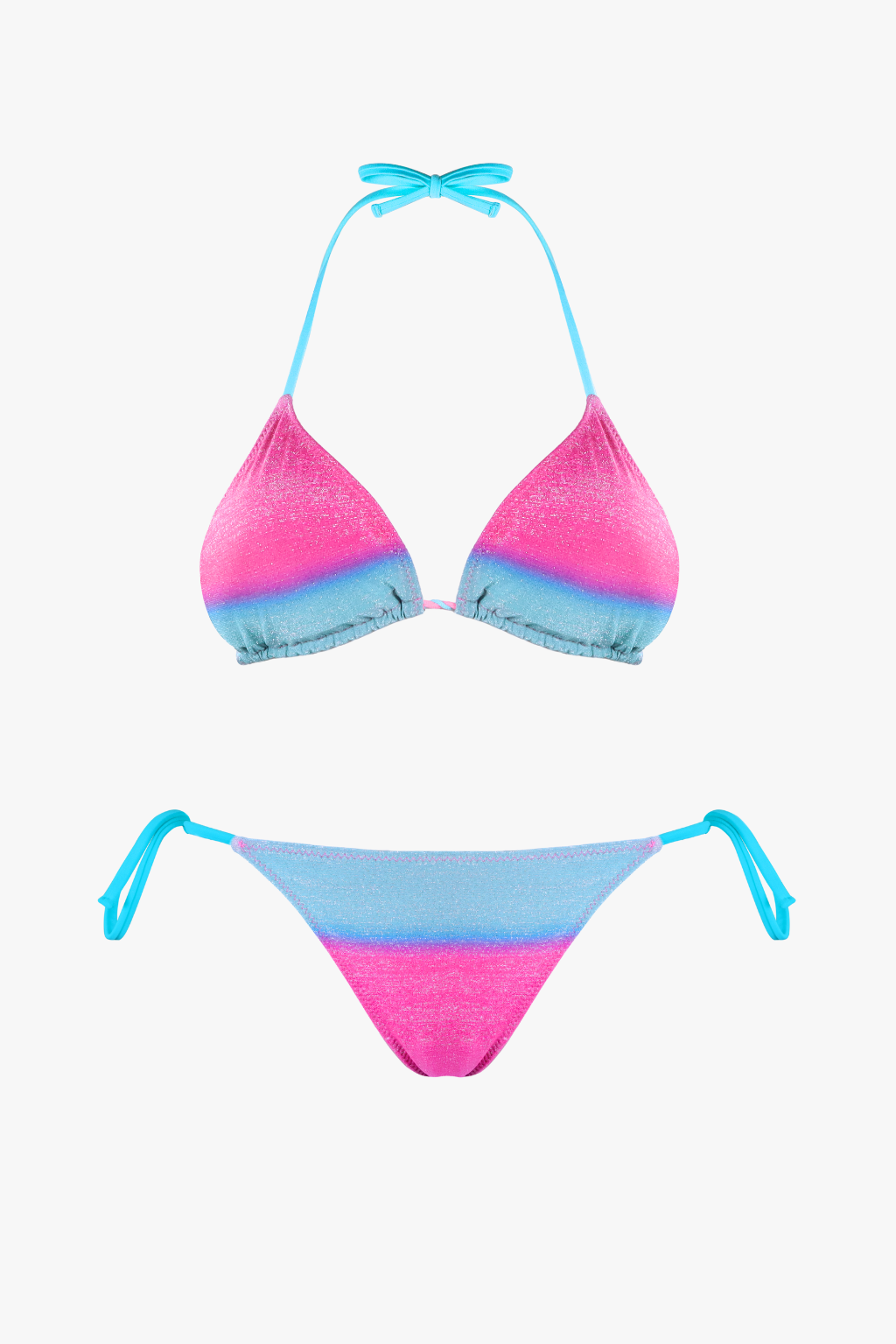 Lave à mão em água fria com sabão neutro após cada uso. Não use alvejante ou amaciante. Não lave na máquina, não seque na secadora, não passe a ferro e não torça; coloque em uma superfície plana para secar à sombra. Enxágue o sal, o cloro, o protetor solar e os óleos, e evite superfícies ásperas (especialmente em tecidos metálicos/lurex). O sol e o cloro podem reduzir gradualmente a intensidade da cor — isso é normal. Não deixe de molho e guarde somente quando estiver completamente seco.